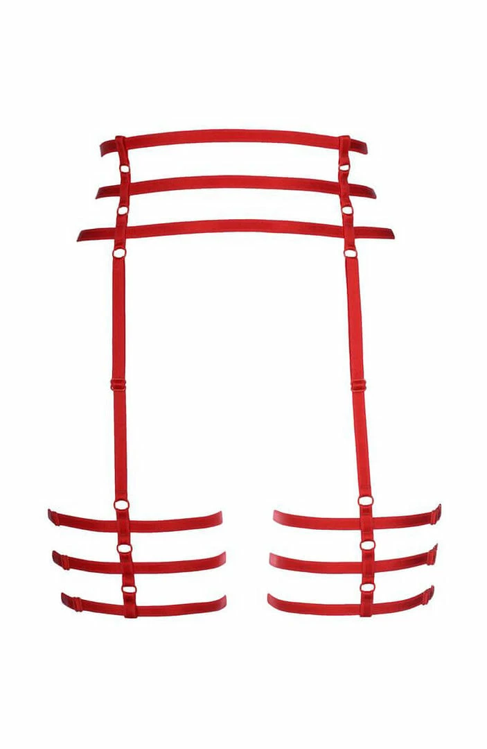 Sexy red harness garter belt in the most sassy cage-strap with cage-suspenders.