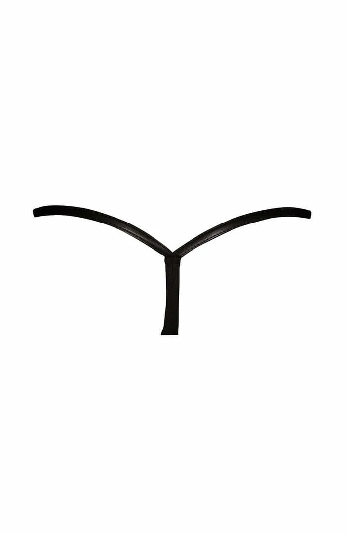 Small black transparent string panties with wet look trim. The panties has small silver clasps on either side, making it possible to open them from either sides, giving them an erotic and provocative twist.