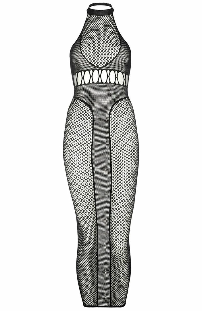 Sexy long black dual net dress with a sexy open back and cut-out. The dress is made from soft and incredibly elastic mesh – and has a flattering snug body fit!