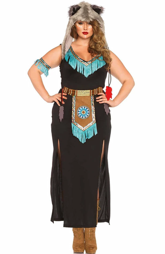 This totally complete plus size indian costume features a long fringe trimmed dress with the mandatory beaded aprob belt, and matching turquiose fringe arm piece.