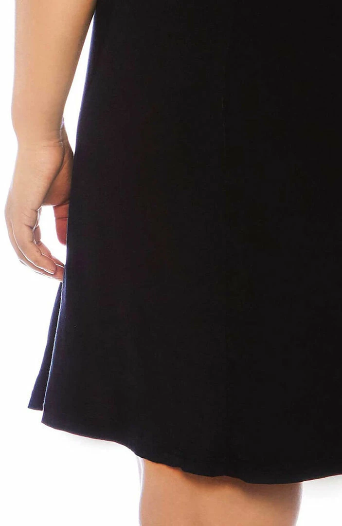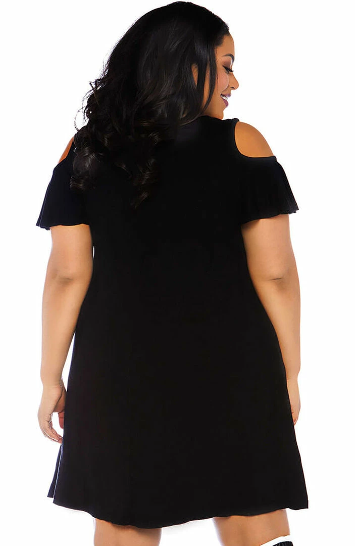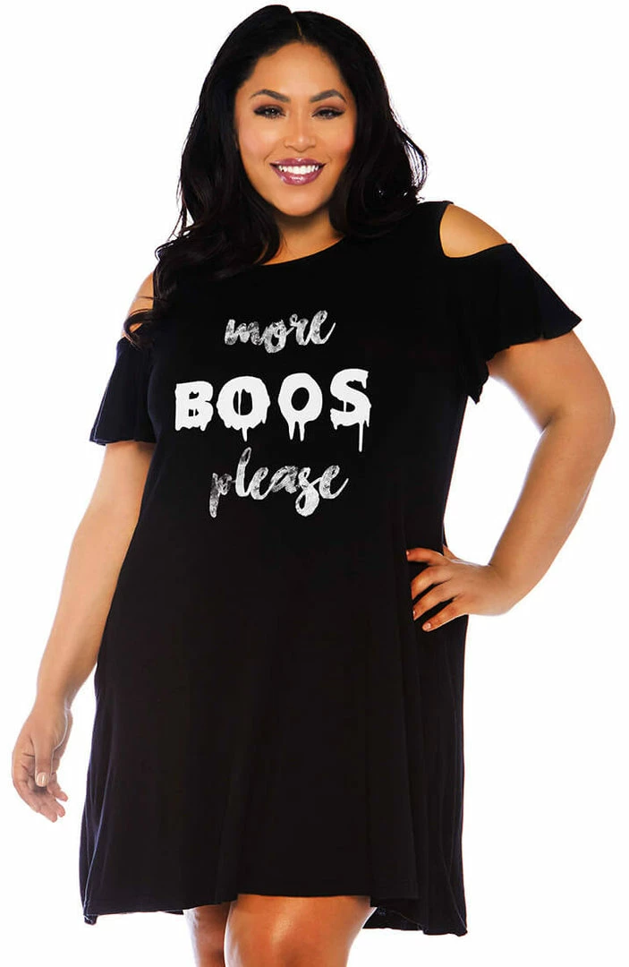 Cool and comfy plus size Halloween dress featuring a black cozy long sleeve jersey dress with keyhole bodice.