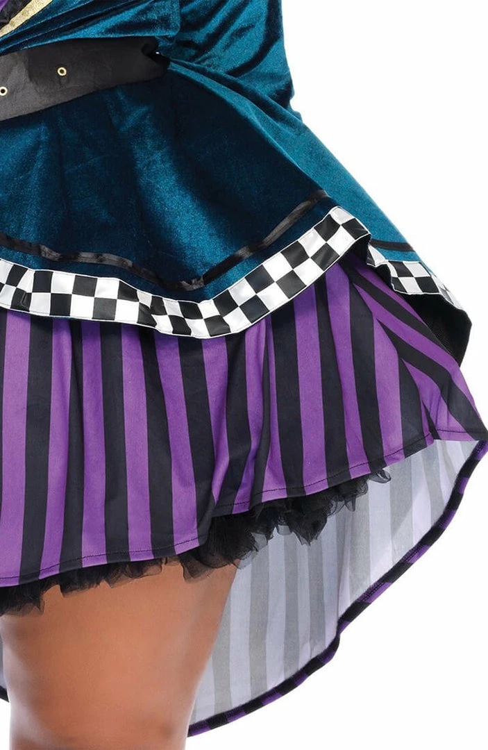 The costume features a long peplum tuxedo coat in the most beautiful blue velvet material, decorated with black satin & gold coloured trim. Under the coat you find the cutest dress in several purple nuances.