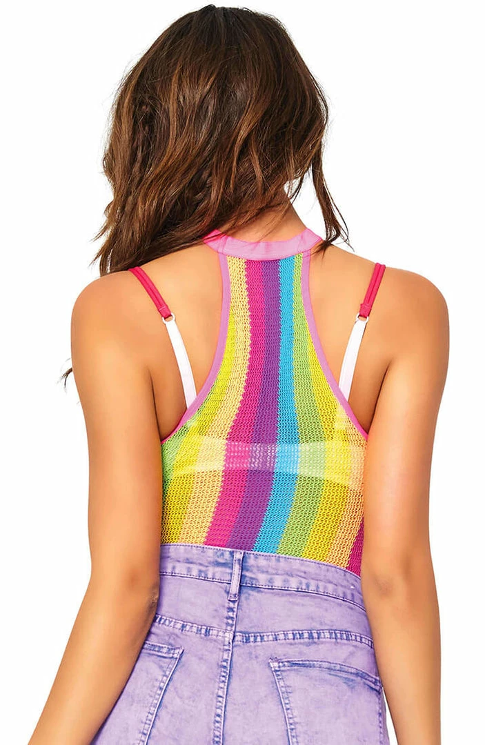 Super chic fishnet bodysuit with halterneck, in the most amazing and bright rainbow colours!