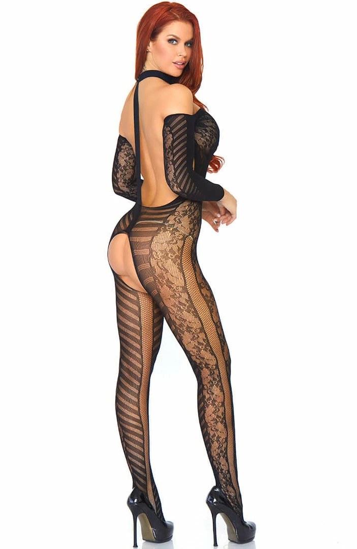 Black crotchless bodystocking in striped mesh with beautiful lace panels and an incredibly sexy top part with a black harness choker.