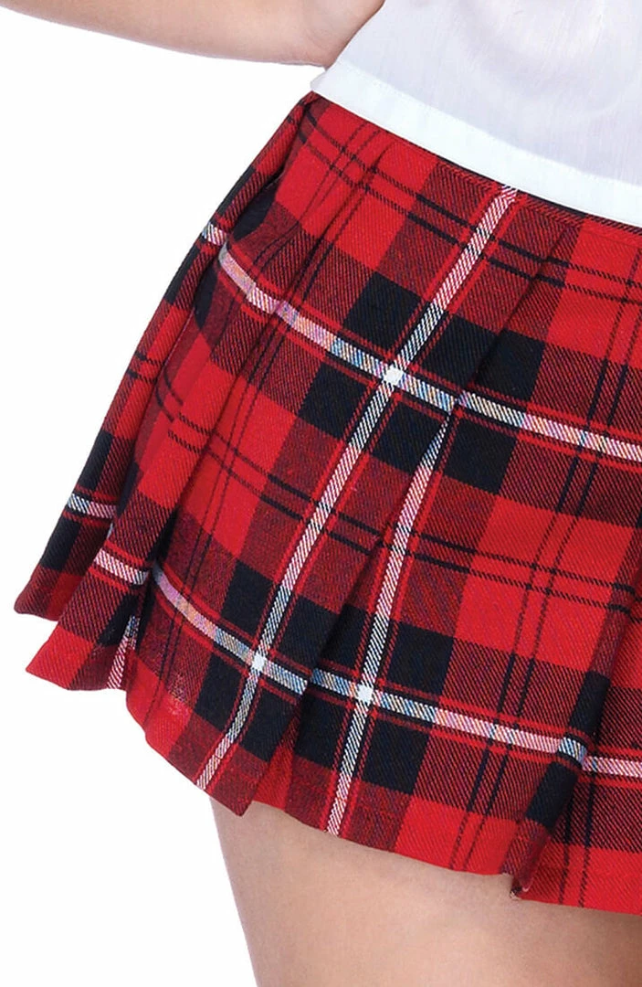 Sexy school girl costume featuring a classic red plaid pleated skirt, a short sleeve white shirt with buttons and a small pocket on the chest, a pair of black ‘geek’ glasses in plastic and a long black tie.