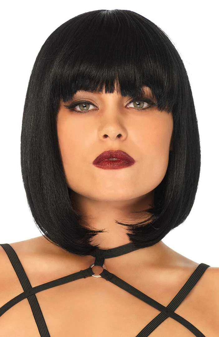 Super sexy and seductive black bob wig with fringe and slightly rounded tips.