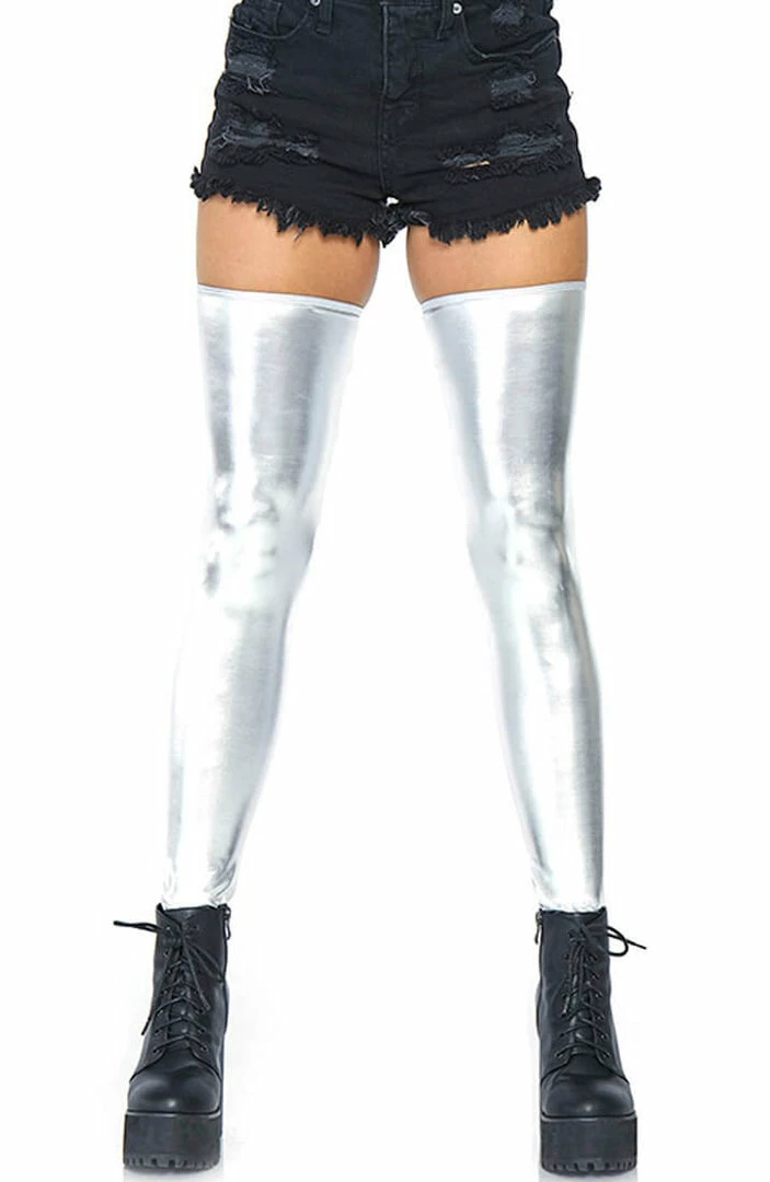 These shiny silver colored wet look thigh high stockings are incredible sexy and super cool – guarantees a perfect fit and a good time.
