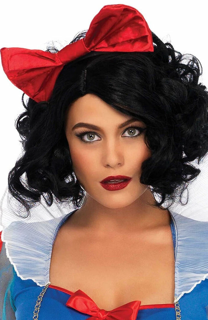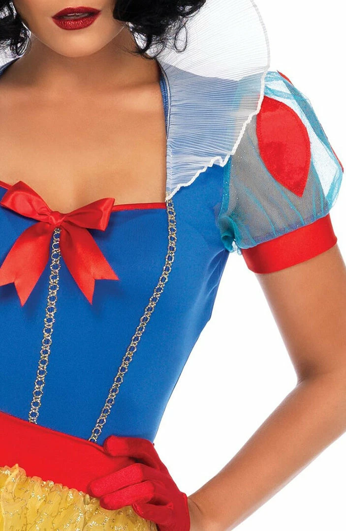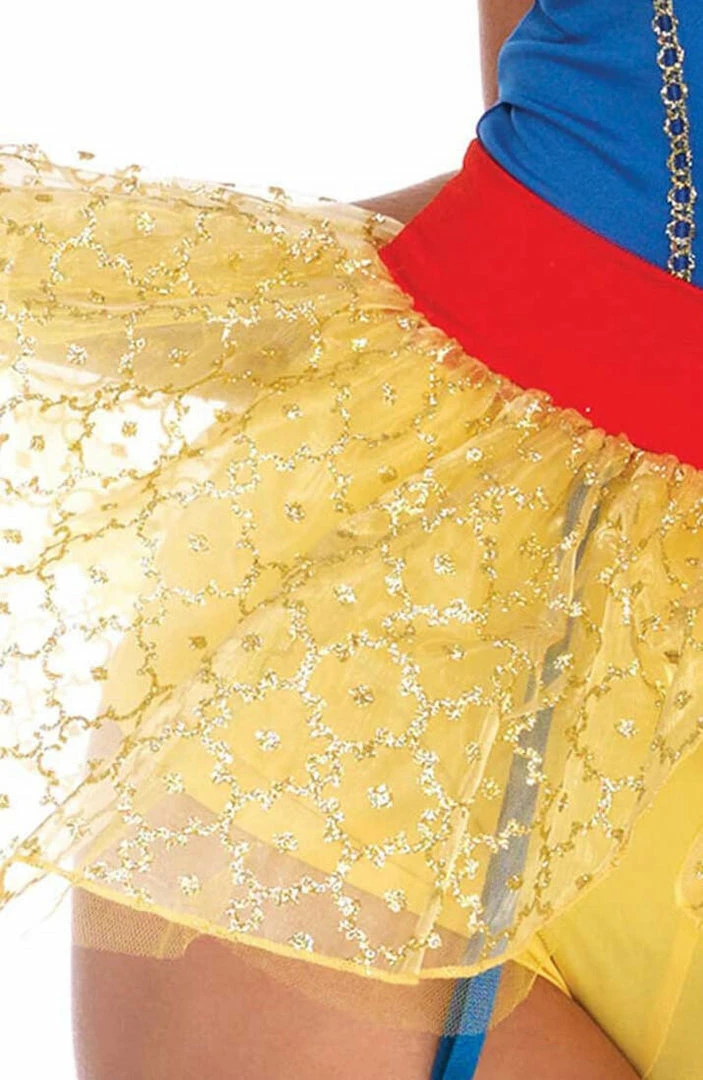 Sexy Snow White costume featuring a character romper with a stay up collar, glittery sheer yellow skirt,an oversizes red back bow and blue suspenders that gives the look a sexy touch!