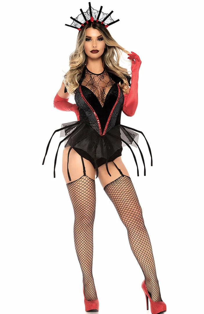 This creepy spider costume features a sequin trimmed garter bodysuit with a net spider leg skirt, furry detachable spider tail, and a jewel web crown headband.