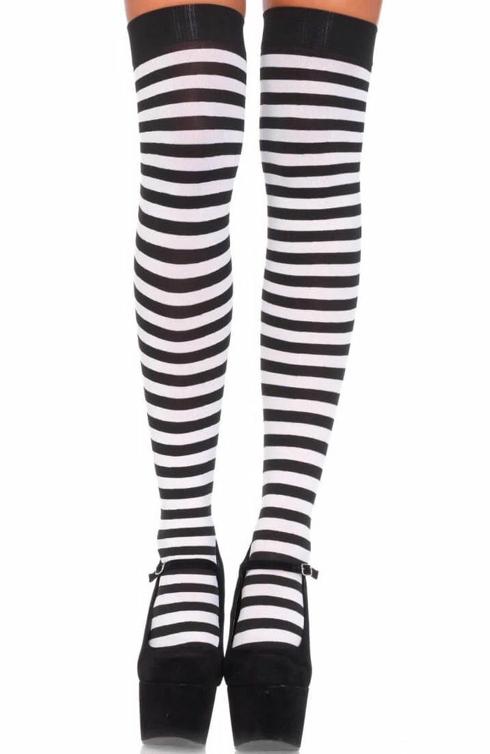 Comfortable and soft white and black striped thigh highs in a thick material.