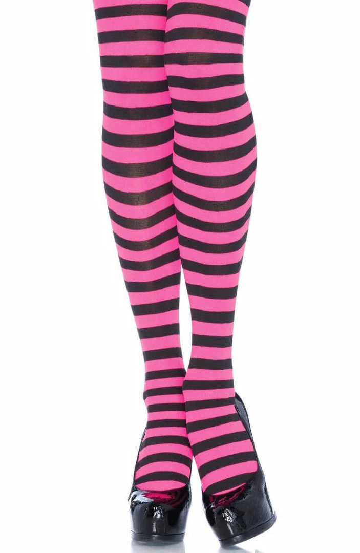 Comfortable and soft pink and black striped thigh highs in a thick material.