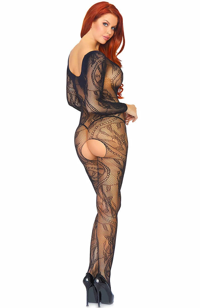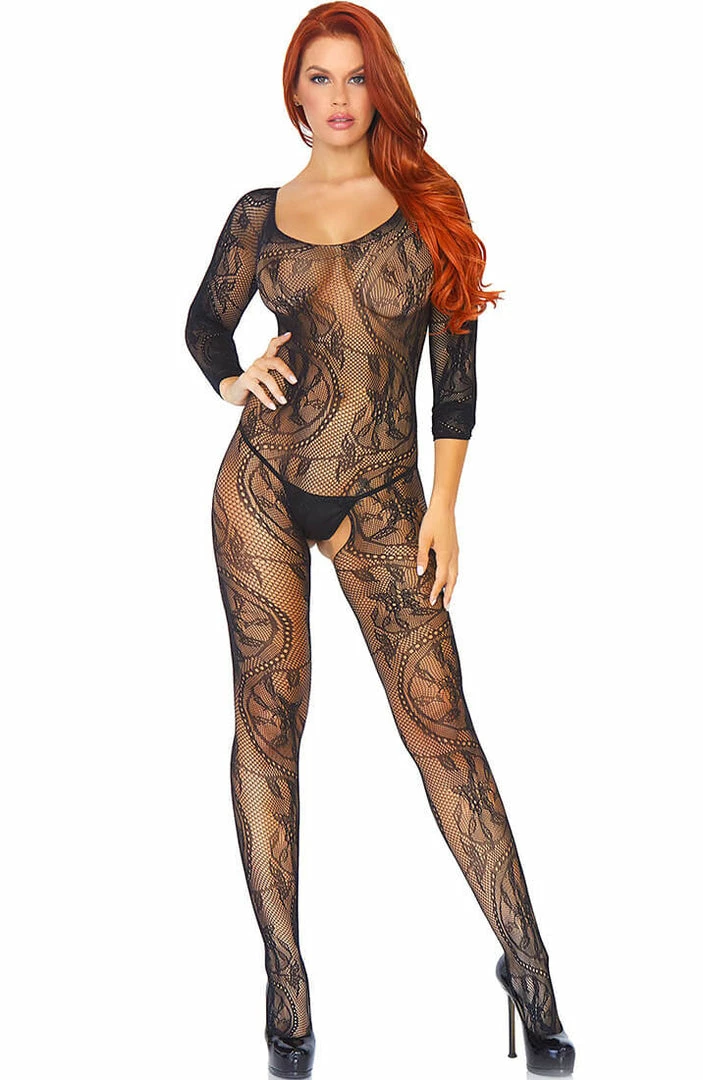 Sexy, sassy and incredibly seductive black mesh catsuit in swirl lace. The bodystocking has long sleeves and a flattering deep neckline.