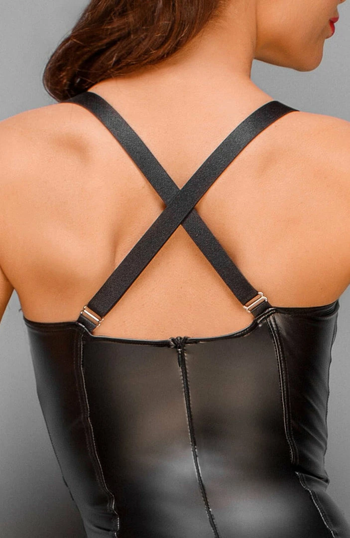 Sexy black wet look dress with decorative elastic cut-out bandage dice pattern at the waist and bust.