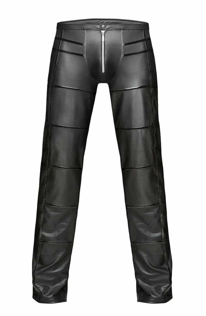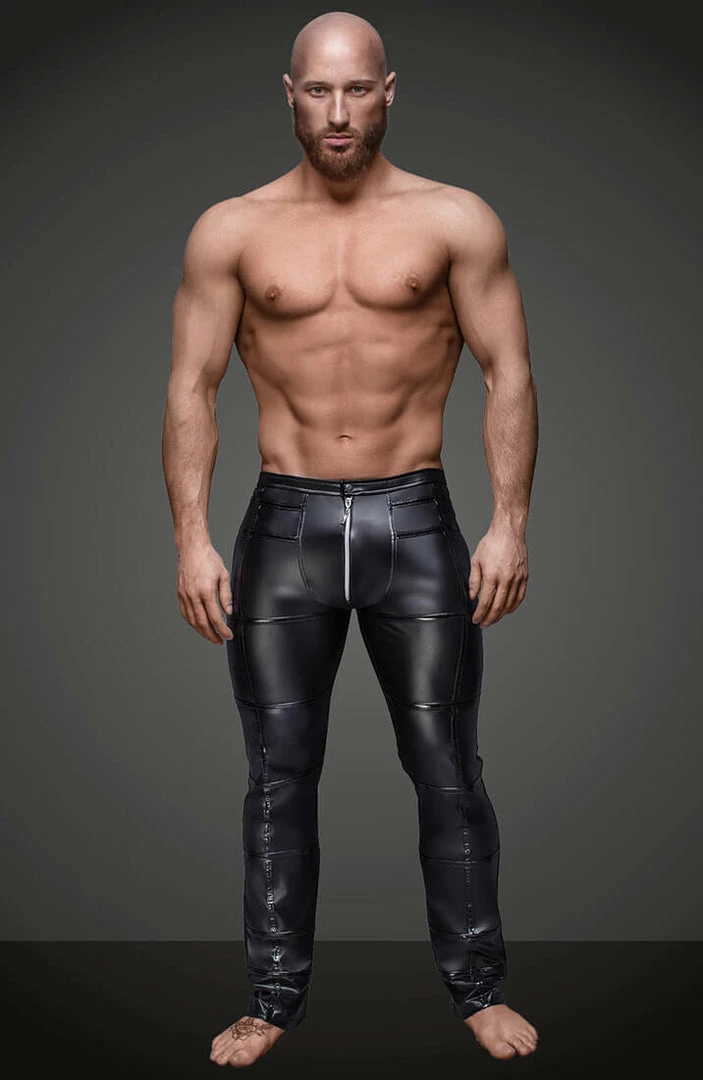 Black wet look pants with a silver zipper at the front and vinyl panels.