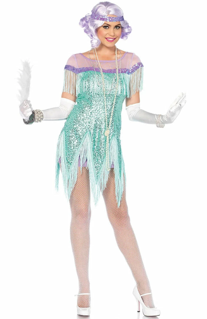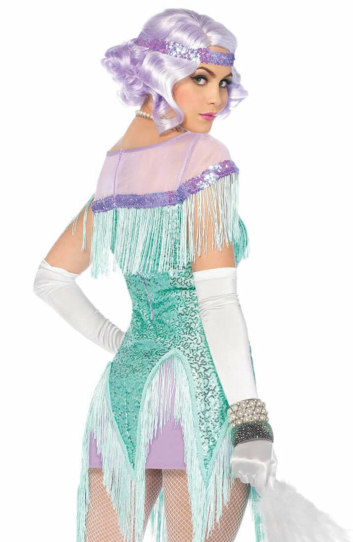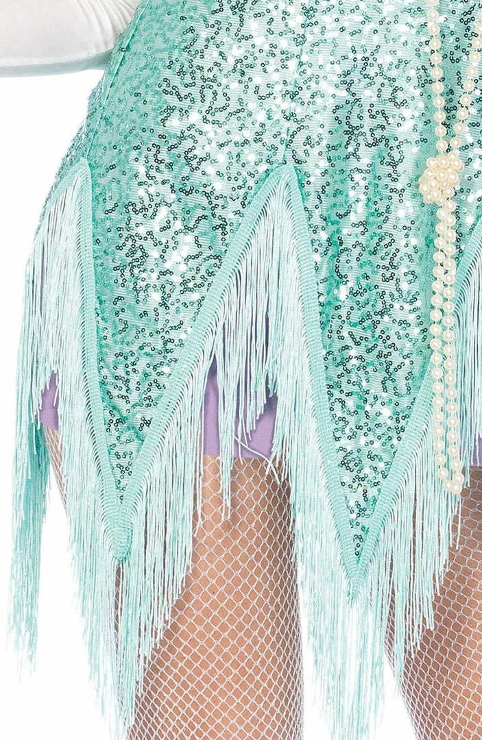 The flapper girl costume is decorated with the most delicate small turquoise sequins and long fringes.