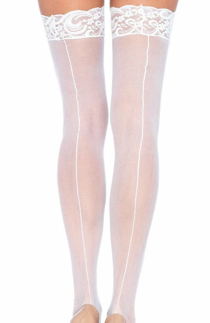 White sheer nylon thigh high stockings with backseam and a sexy lace top designed to be worn with suspenders.